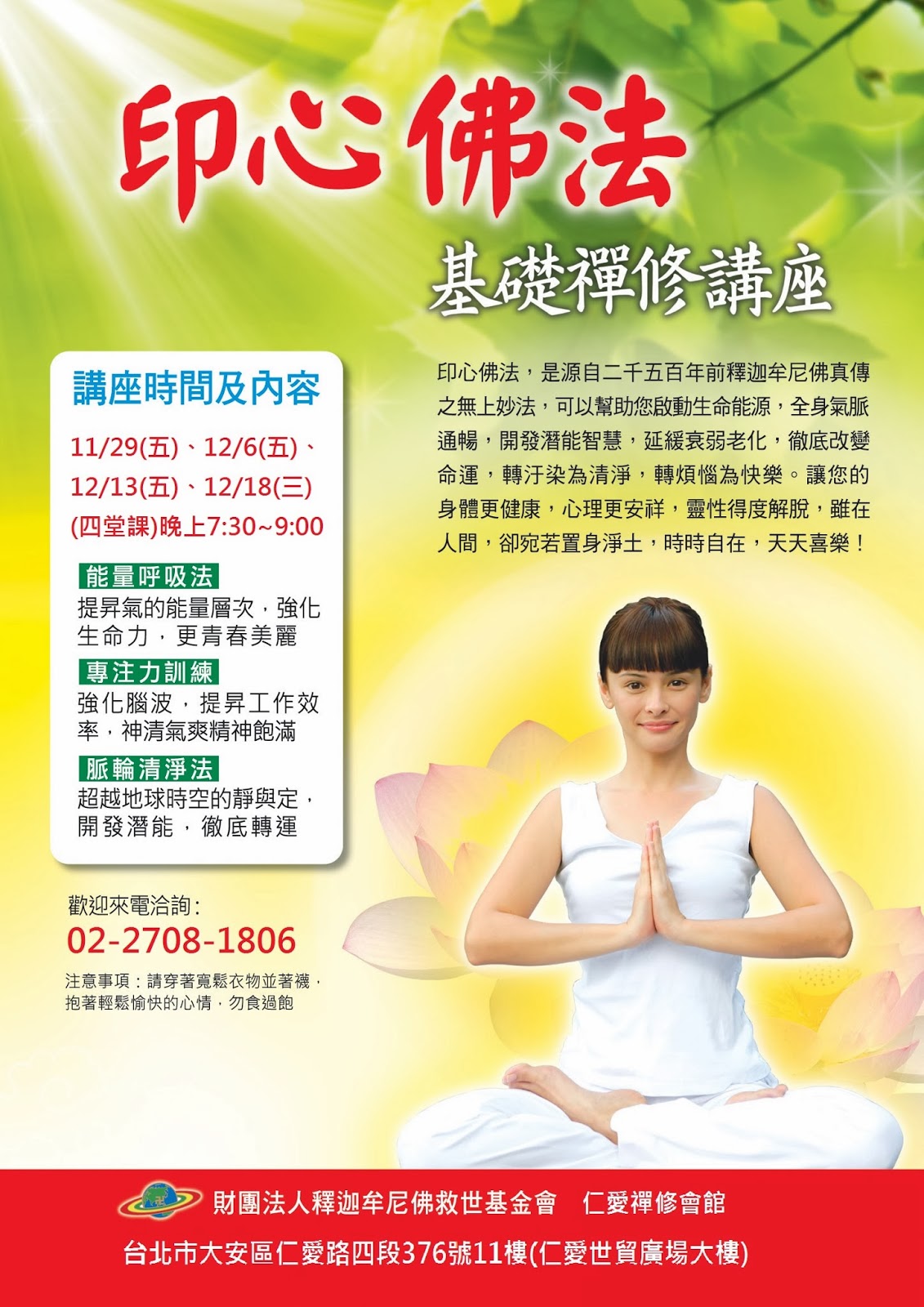 1.基本禪定要領教導:專注力練習、能量呼吸法(深呼吸、腹部呼吸)、實際禪坐體驗、潛能開發
